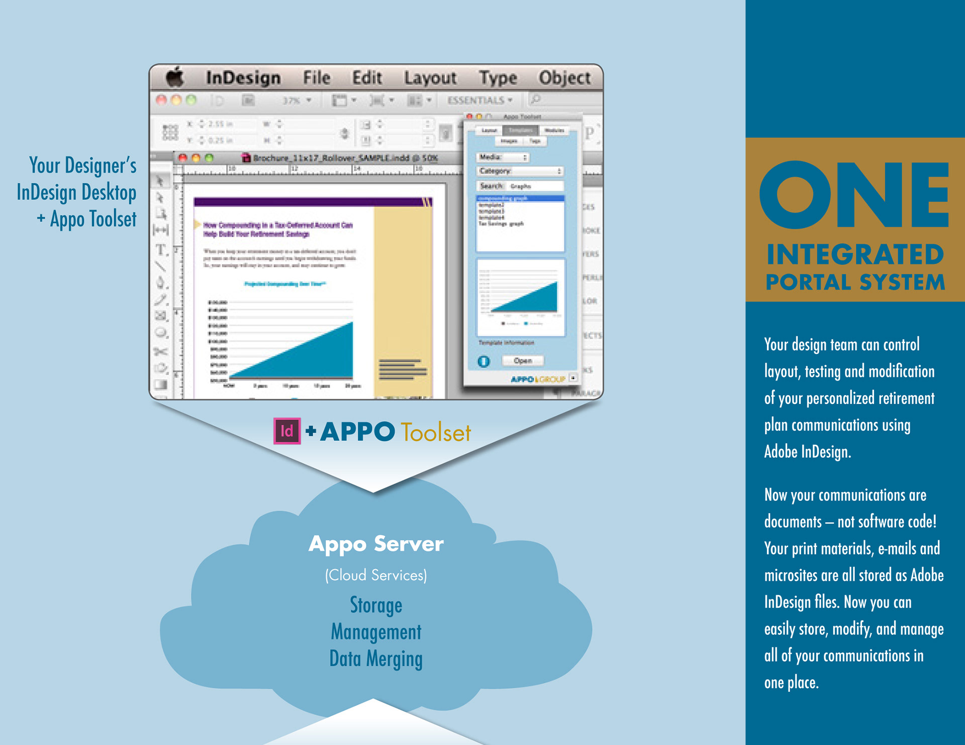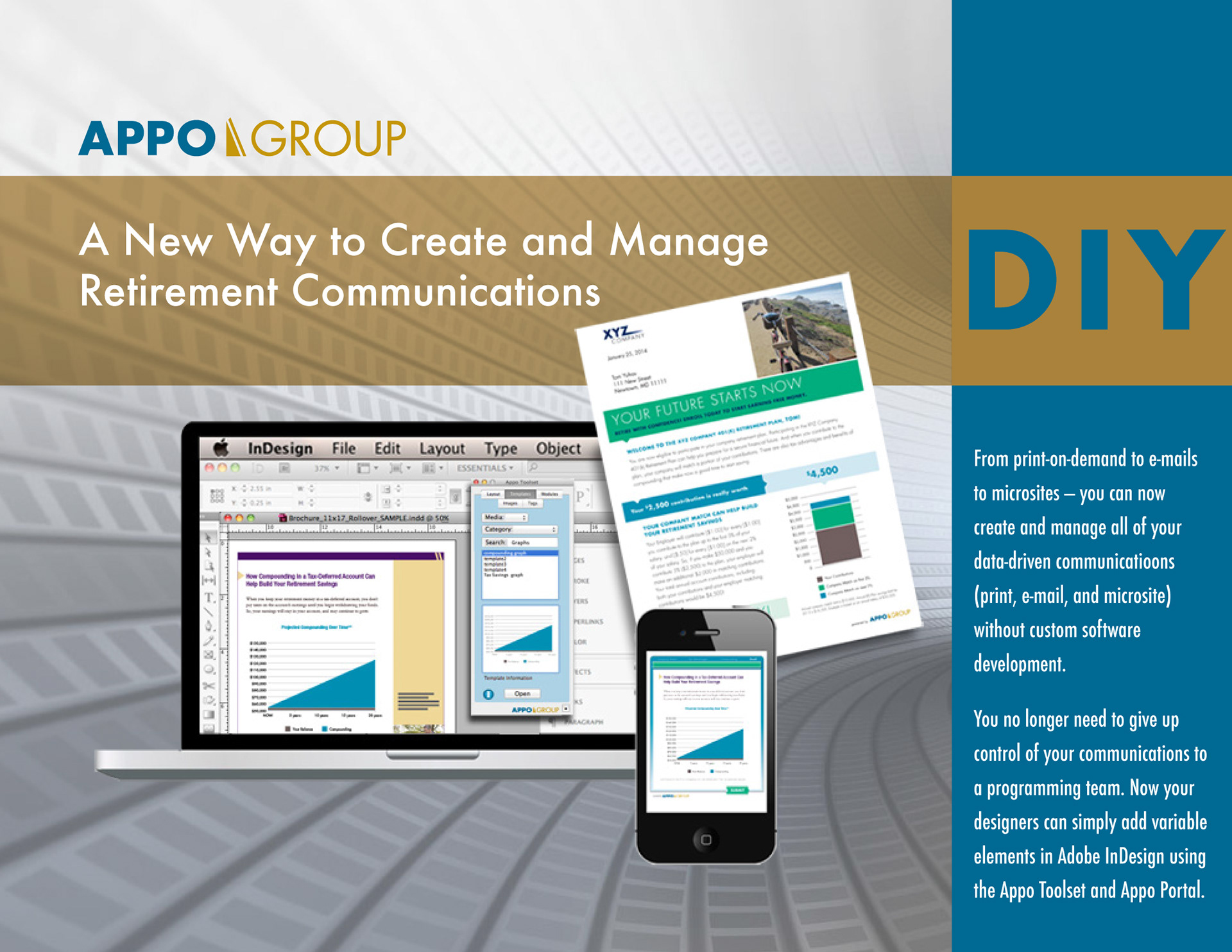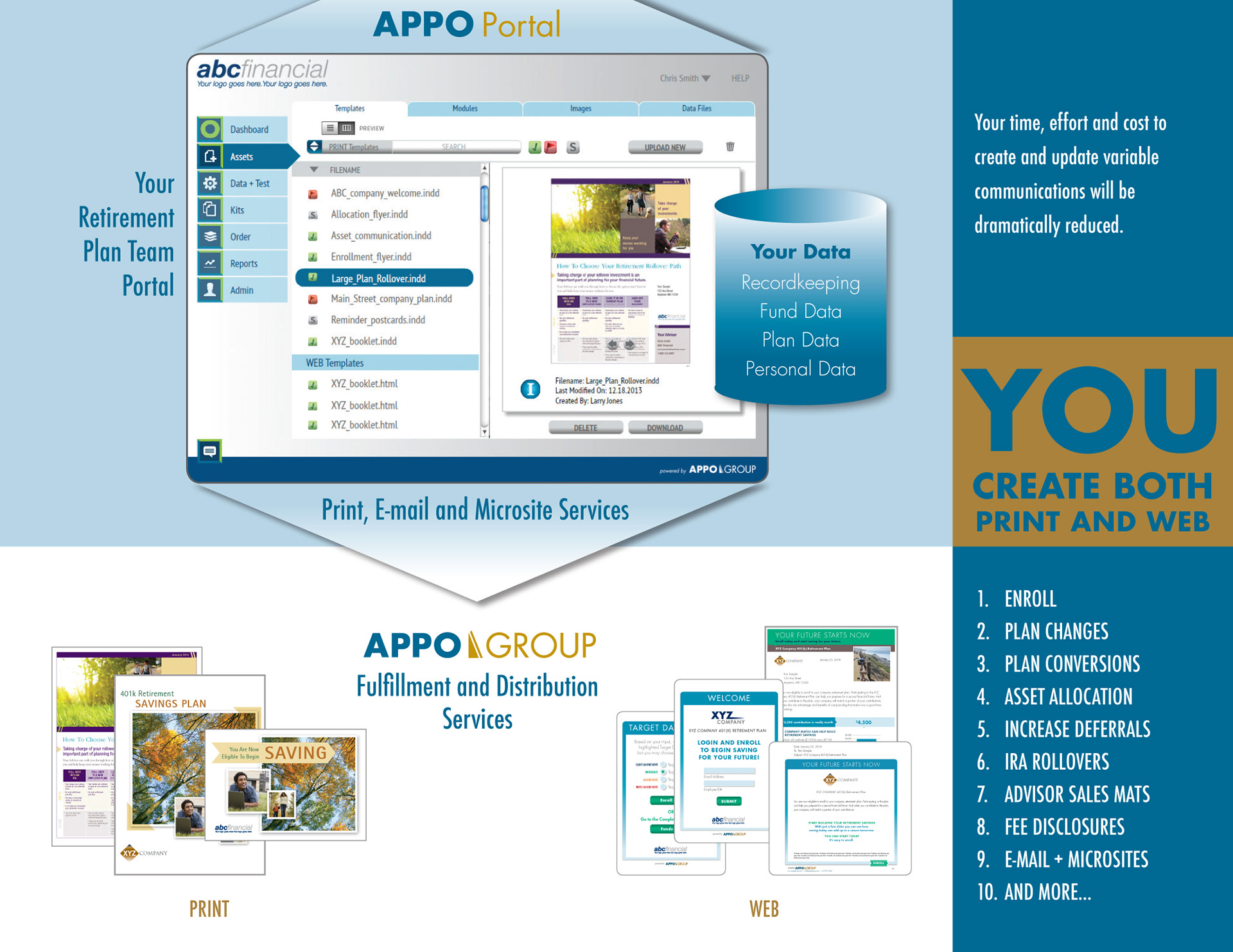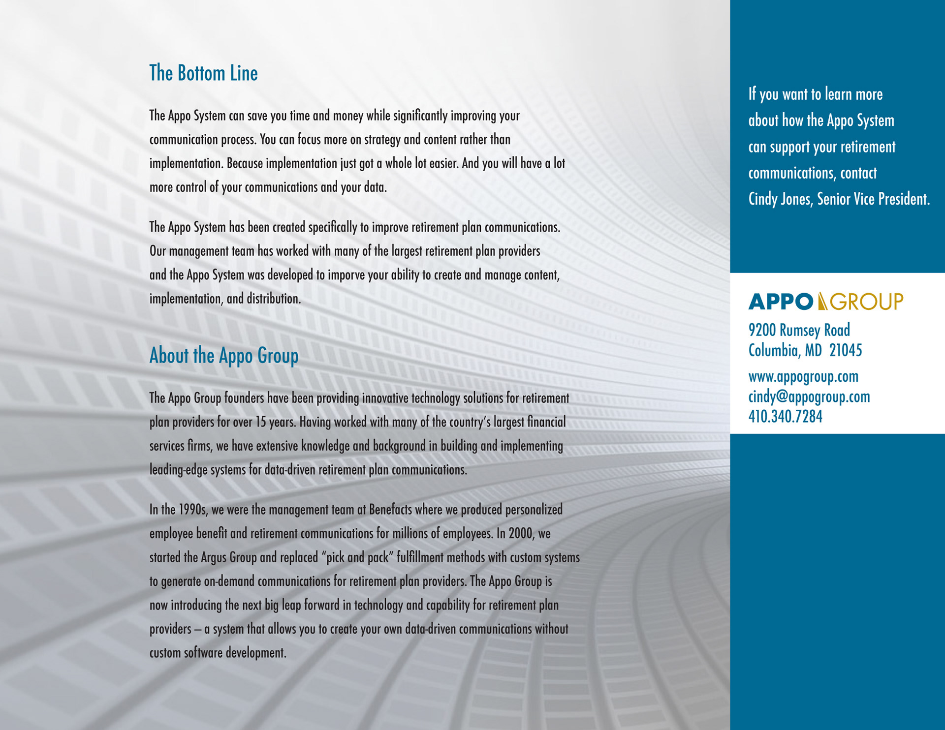 I created the brochure look and feel as well as all infographics and charts for AppoGroup. This brochure opens vertically like a calendar. You can also see the website I designed and built at www.appogroup.com