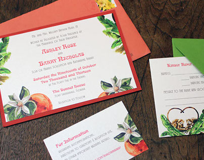 I created custom illustrations and the design for the Wedding Invitation, RSVP card, Save the Date Card, Information Card, Matching color envelopes and hotel guestroom doorhangers. This couple requested an illustration of the bonnett House in Florida where the wedding was to be held in the dominant color scheme of salmon and grey. All materials digitally printed and hand tipped onto colored stock.