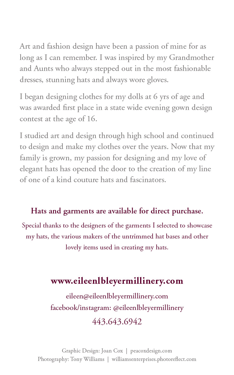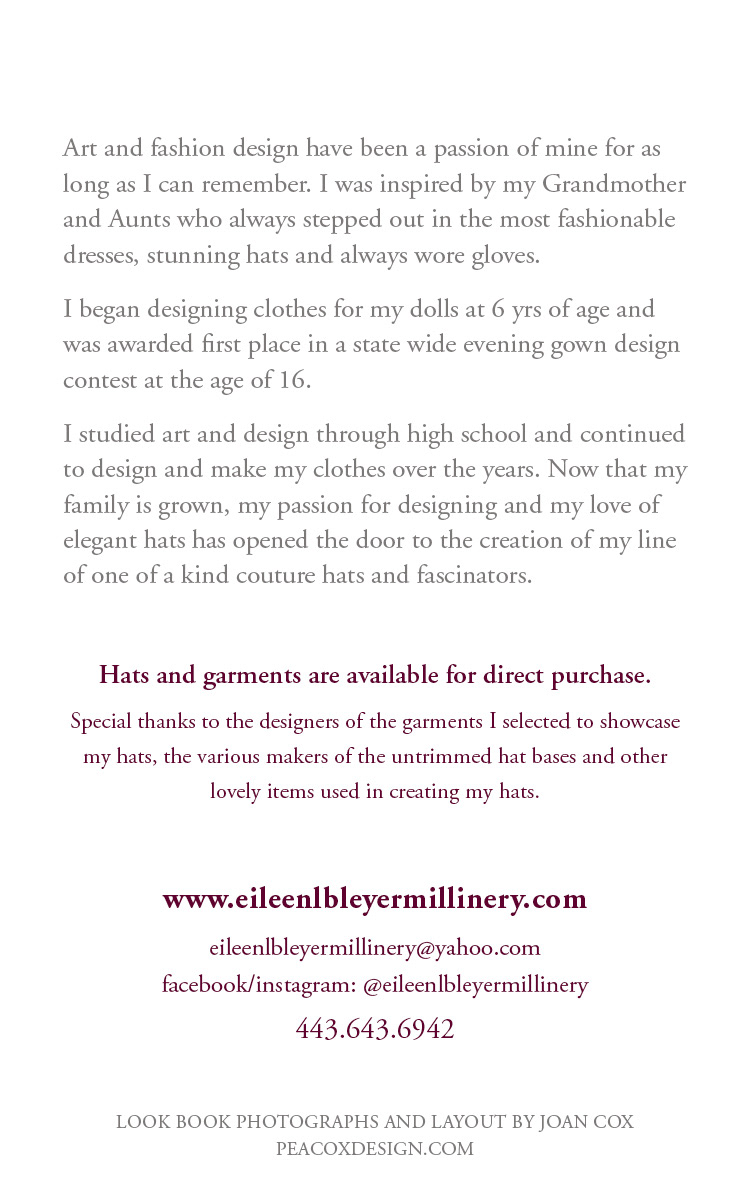 Create logo and branding for all Fashion Week look books and marketing materials for Eileen L Bleyer Millinery.